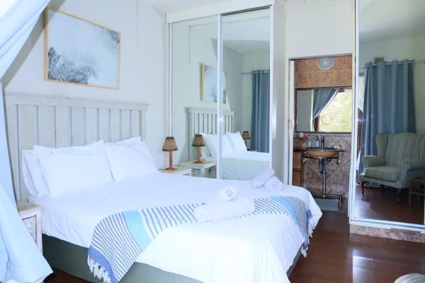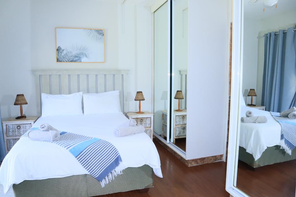 Accommodation comprises two well-appointed bedrooms. The main bedroom offers a cozy coastal aesthetic with a queen-sized bed, mirrored sliding wardrobe doors, and a convenient en-suite basin. The second bedroom features a double bed, rustic wooden bedside tables, and a mirrored wardrobe. Both bathrooms are tiled, with one offering a glass-enclosed walk-in shower and integrated sink, while the other includes a modern toilet and faucet.