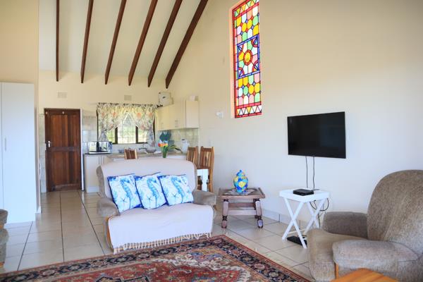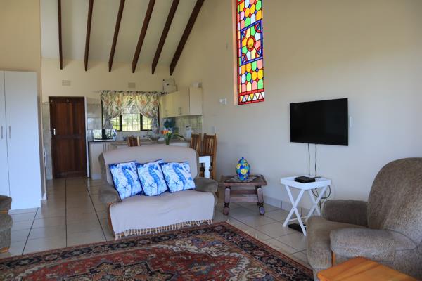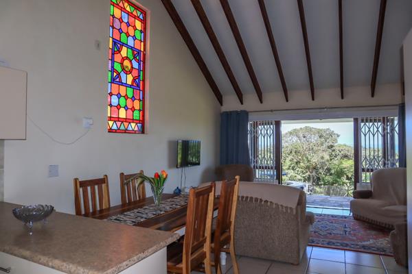 The interior features an inviting open-plan living and dining area, characterised by high vaulted ceilings with exposed wooden beams that add architectural interest and a sense of spaciousness. A unique stained-glass window serves as a captivating focal point, filling the space with decorative light. Tiled flooring and carpeted bedrooms ensures durability and easy maintenance. The functional kitchen is equipped with ample counter and cabinet storage, a double sink, and a breakfast bar, making it ideal for everyday living. French doors lead directly to an outdoor patio, perfect for enjoying the garden and the refreshing coastal air.