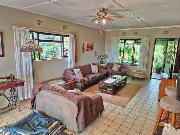 The adjoining wingcurrently set up as a private flatletmirrors the charm of the main residence, with its own covered front patio and cosy lounge. A long passage connects two bedrooms, a bathroom, and a kitchenette that leads out to a private back patio framed by flowering creepers and ornamentals. Partial ocean views peek through the trees on one side, while a garden hut, greenhouse and clothes rail complete this peaceful, self-contained space.