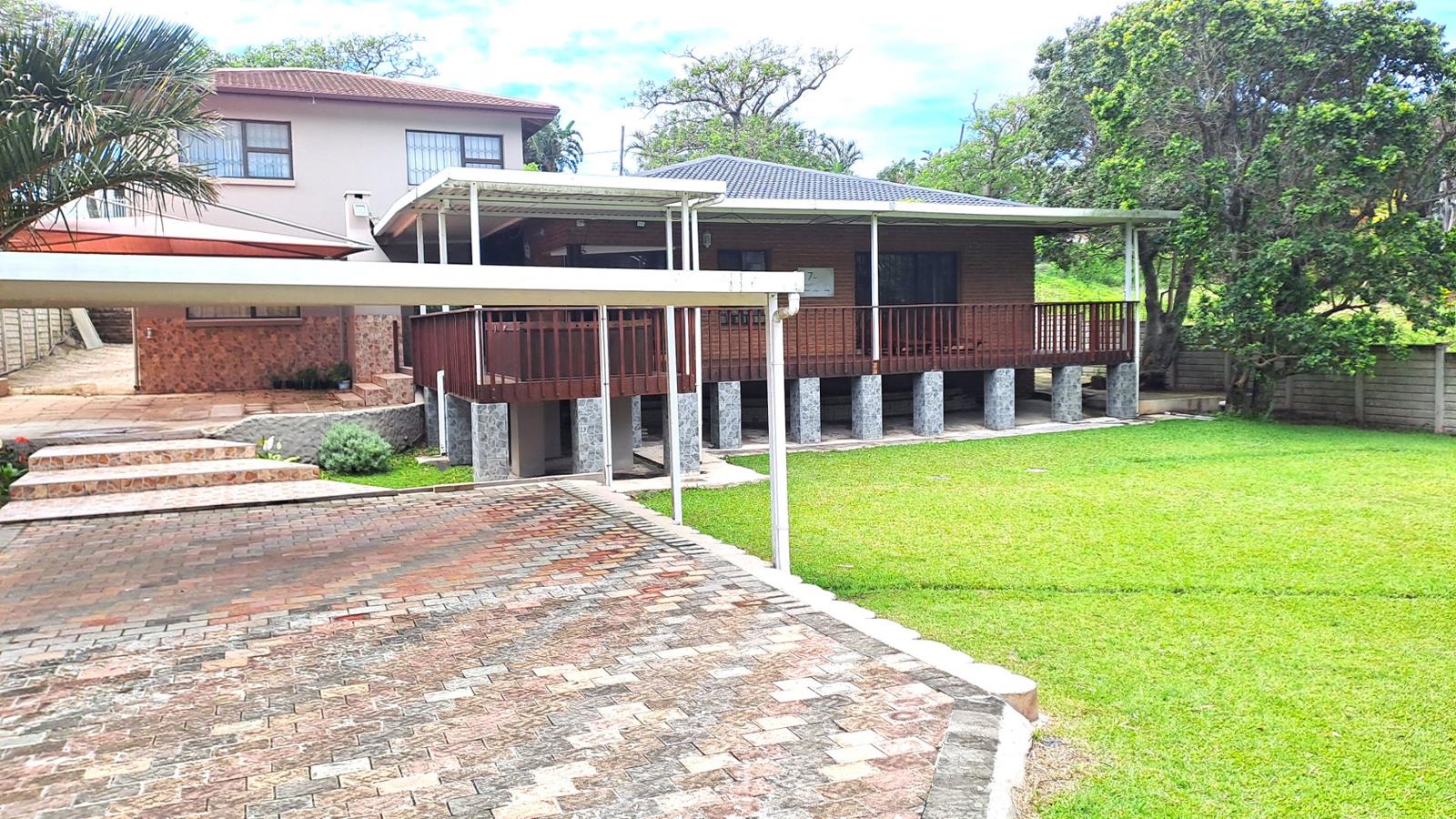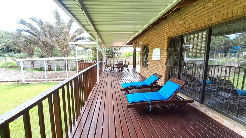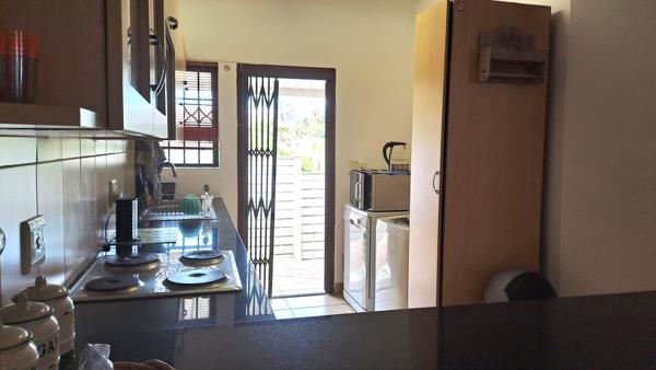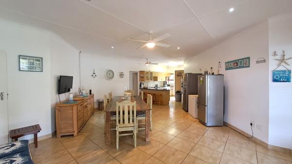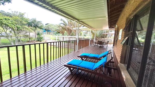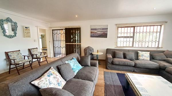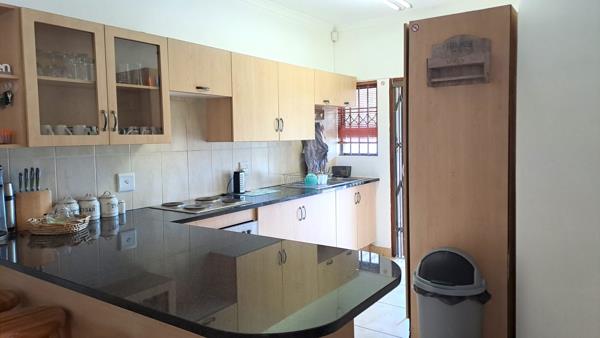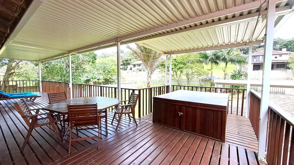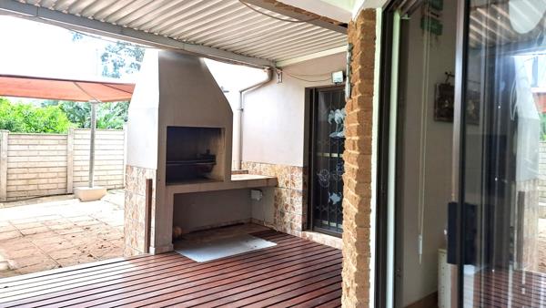 Fully enclosed property boasts a large open plan kitchen and dining area with a breakfast nook which opens onto the undercover braai and jacuzzi area and wooden deck that over looks the garden. Five decent size bedrooms with ample BIC, all have fans and there are three bathrooms. The air-conditioned main bedroom downstairs that opens onto the wooden deck has an en-suit with a shower, basin and toilet. The second full bathroom, with a separate toilet, serves the other two bedrooms and a third bathroom upstairs serves the two upstairs bedrooms. The airconditioned spacious lounge is separate with sliding doors that also open up to the braai and jacuzzi area.