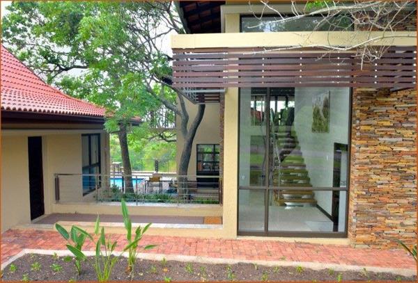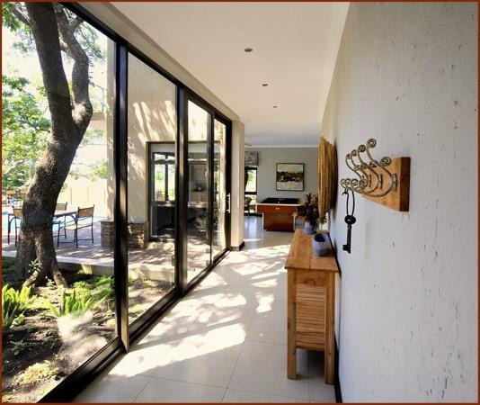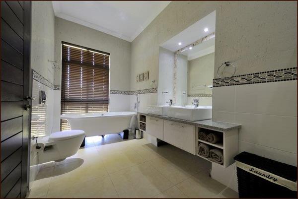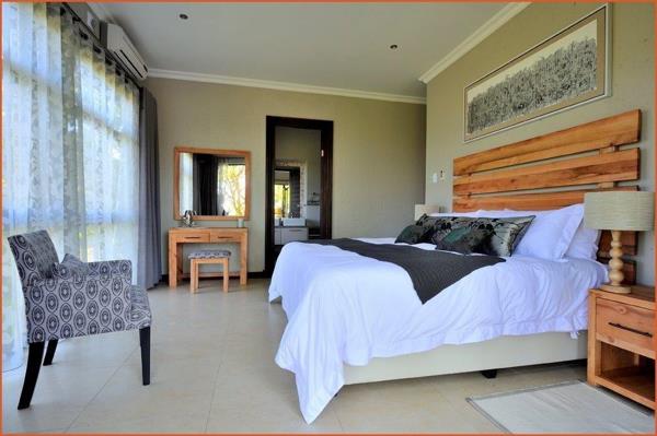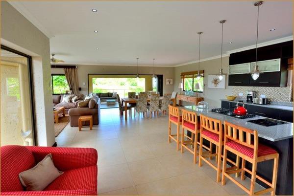 Modern stairs lead to the upper level with a spacious open plan area encompassing a lounge and dining room which also opens onto an expansive verandah with stackable doors. The verandah has a built in stainless steel braai and has views over the estate and the pool area. A modern kitchen with a separate scullery, well equipped with top of the range appliances. The kitchen functions around a large island a great entertainment area with space for seating guests informally. The scullery opens onto an outside courtyard.