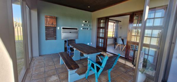 The downstairs area offers two bedrooms and one bathroom. Open plan kitchen and living area leading onto braai and enclosed entertainment area with ocean views.