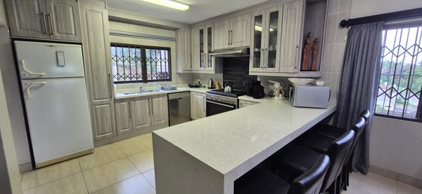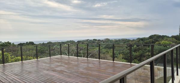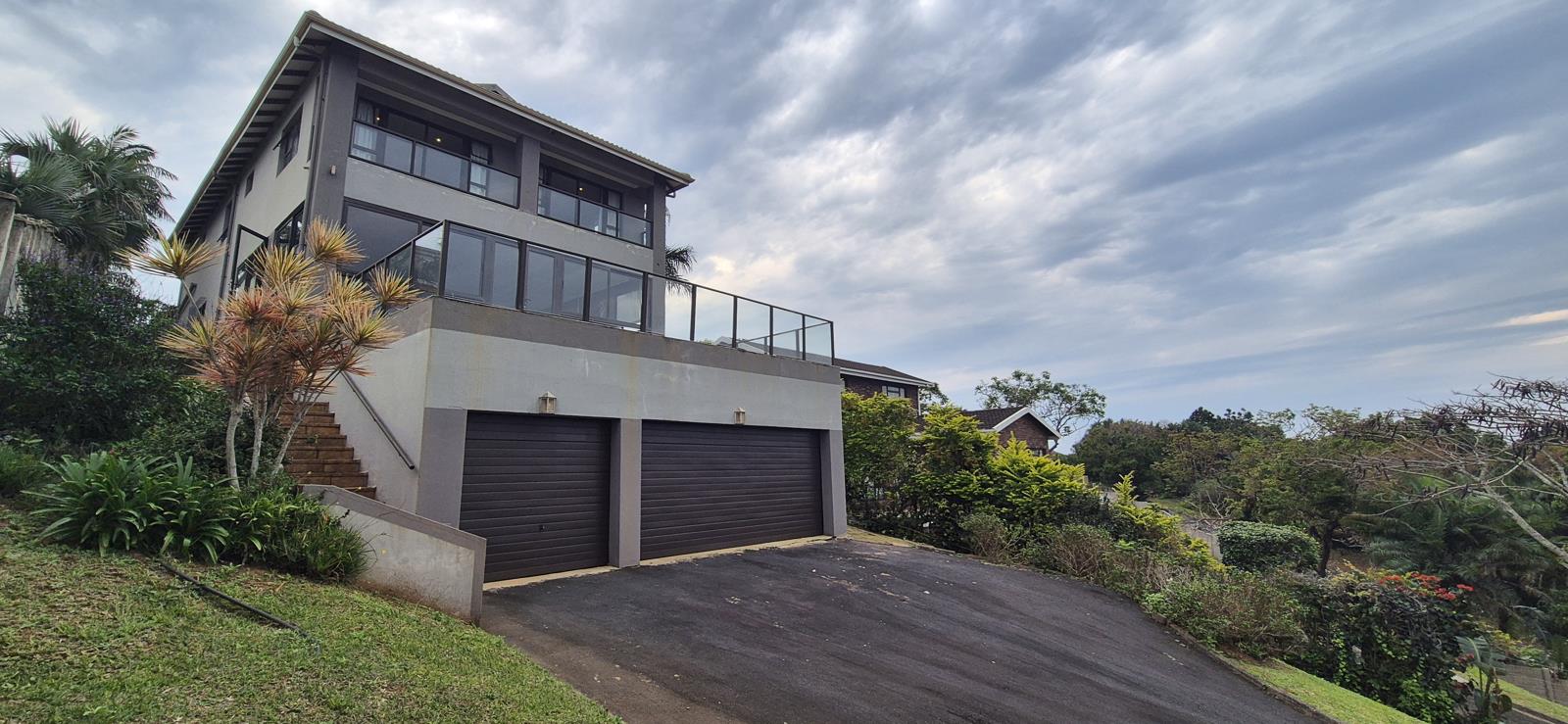 Perched at the top of the valley, this double-story home enjoys a prime position with sweeping views that stretch all the way to Port Edward. At the heart of the home is a stylish kitchen, finished with Caesar stone countertops, a breakfast bar. Its equipped with a gas stove and electric oven hob, combining modern functionality with elegant design. The kitchen flows seamlessly into the dining area and TV lounge, creating a warm, inviting space for family and friends. Stack-away doors open from both living areas onto an enclosed glass-paneled patio. The patio is an ideal spot for entertaining or relaxing. Beyond, is a spacious wooden deck with glass balustrade which offers uninterrupted views of the ocean and surrounding landscape. The lower level includes one bedroom with a separate bathroom, conveniently fitted with washing machine and tumble dryer connections. Upstairs, there are five bedrooms each feature built-in cupboards and their own en-suite bathrooms. Two of the main bedrooms share a balcony with stunning coastal views.