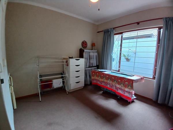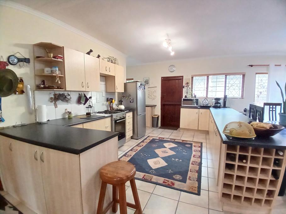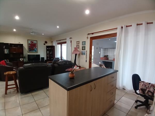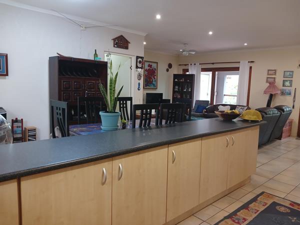 The heart of the home is its open-plan living space, where the lounge, kitchen, and dining areas flow effortlessly into a covered patio ideal for hosting braais and relaxed gatherings. A double garage with soaring ceilings adds practicality, with one automated and one manual door for easy access.