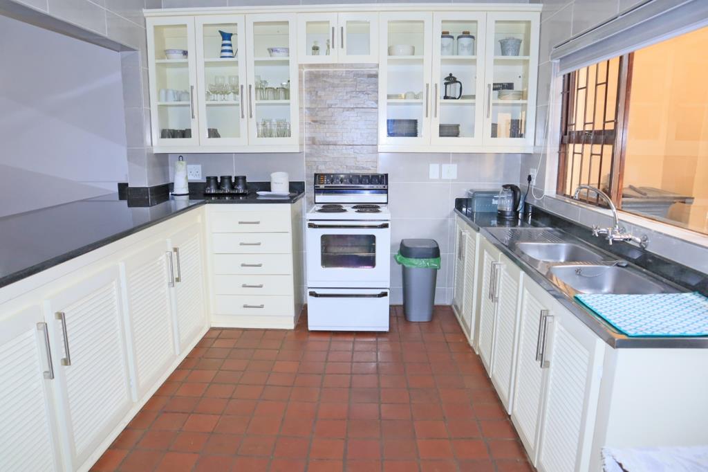The interior features an open-plan lounge and dining area, providing a versatile space for relaxation and entertaining. The functional kitchen is equipped with ample white cabinetry, including louvered lower cabinets and glass-front uppers, complemented by dark countertops and a double stainless steel sink. A convenient pass-through window connects the kitchen to the adjacent living space, enhancing flow. Tiled flooring throughout ensures easy maintenance.