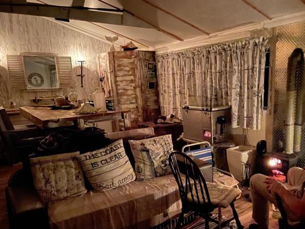 A charming off grid Fisherman''s Cottage, complete with Jojos and solar lighting.