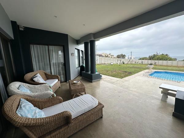 Aluminium stack back doors lead you out from the lounge to a spacious undercover patio with a built-in braai and a sparkling swimming pool.