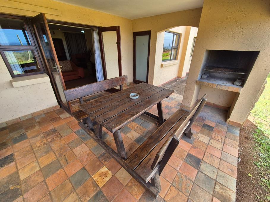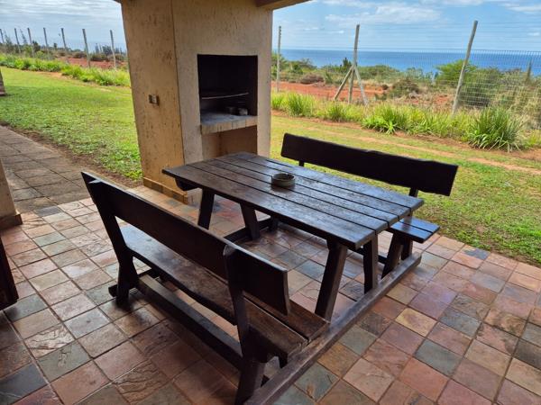 Outdoor living is a highlight, with a covered patio thats perfect for entertaining. It features a built-in braai and a rustic picnic table, creating the ideal space for al fresco dining. A refreshing swimming pool is available for relaxed dips, and the apartment enjoys distant sea views that enhance its coastal charm.