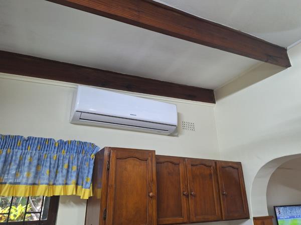 The interior features an inviting open-plan layout, seamlessly connecting the lounge and dining areas. The functional kitchen is equipped with ample wooden cabinetry and counter space, perfect for family meals and entertaining. Each of the three bedrooms provides comfortable accommodation, complemented by two well-appointed bathrooms, including one ensuite for added privacy. Air conditioning units ensure comfort throughout the home, while exposed wooden ceiling beams add a touch of rustic character.