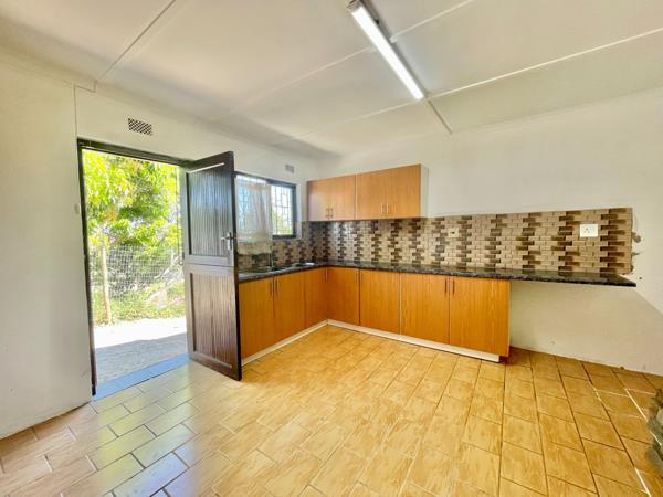 The converted one bedroom flatlet has two entrances with a covered patio and a sliding door. One leads to the partitioned living area and bedroom and the other entrance leads to the kitchen and bathroom.