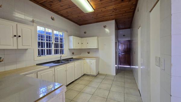 The kitchen is thoughtfully separated from the lounge, ensuring a functional layout. Step out onto the veranda and enjoy the sparkling blue pool, framed by ocean vistas, and surrounded by a well-maintained, lush garden.