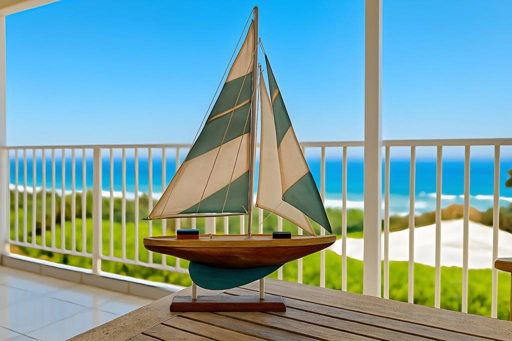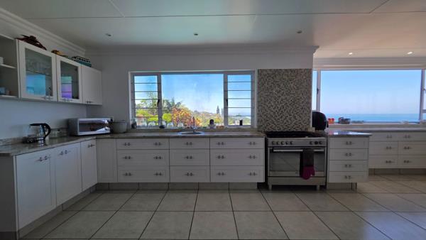 The main residence features a spacious open-plan lounge, dining room, and kitchen with wraparound windows framing spectacular breaker views. The living area opens onto a large undercover balcony, with breathtaking sea views, creating an ideal space for entertaining or simply soaking in the coastal atmosphere. The kitchen is beautifully fitted with granite countertops, wood cabinetry, and a freestanding gas/electric stove, while the separate scullery accommodates all laundry and washing appliances.