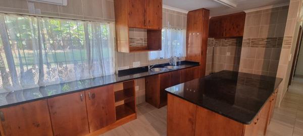 The home consist of 3 nicely sized bedrooms with main en-suite and another one to serve guest and other 2 bedrooms. 2 of the bedrooms have air conditioner, all have ceiling fans and BIC. The lounge/dining room and kitchen is all open plan with an air conditioner and ceilig fans. Kitchen with granite tops and enough space for your big fridges/freezers. The original garage right next to the house with direct access has been tiled and closed off and can be used as family room or an office.