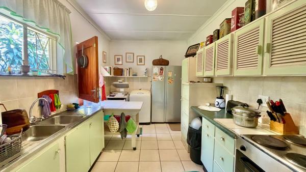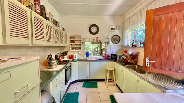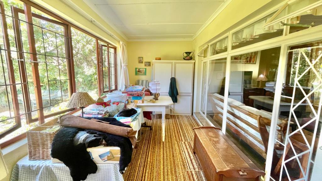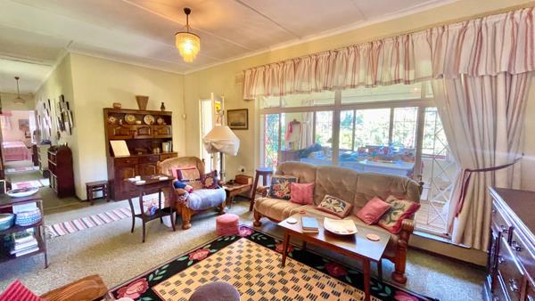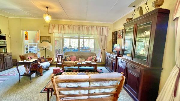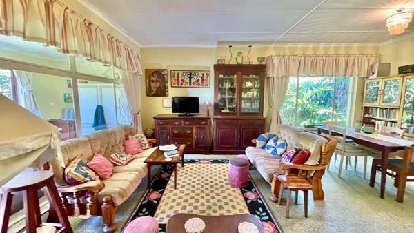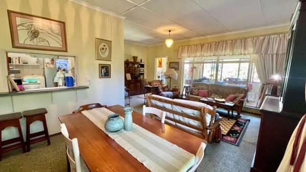 On a short dirt road you meander towards this property with a much loved garden and solid home. The home boasts 4 bedrooms and 2 bathrooms and a large 1 bedroom guest flatlet with a shower and separate toilet. Enter the front door from the glorious garden and there is a study or hobby room on the left and then into the open plan lounge and dining room.