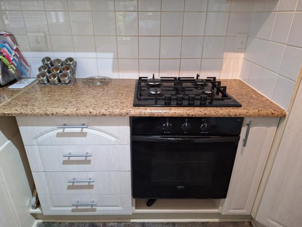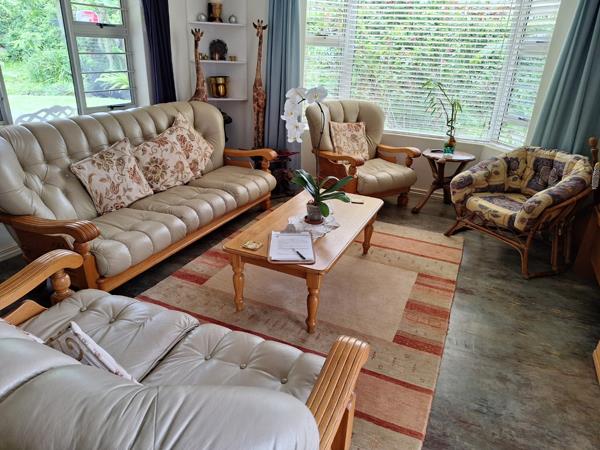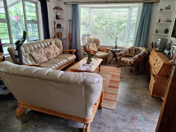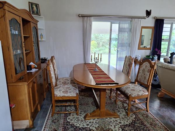 If you are looking for a house to retire in, or for a starter home, this is it! Very spacious 3 bedroom unit with 2 bathrooms of which the main is en suite with a shower, toilet and basin. The other 2 bedrooms get serviced by a full bathroom with shower, toilet, bath and basin. The whole house has screed flooring that gleams like a mirror. Blinds and fans in all rooms. Plenty of built in cupboards in all rooms as well as the kitchen. The built in cupboards are made of laminated timber and is solid. BBL Security Locks mounted on all doors. Kitchen and shower extraction directly connected to a large Whirleybird vent on the roof. Lounge and dining room is open plan and it opens up onto a big undercover patio overlooking the lush garden. No power outages or loadshedding with an 8 panel solar system with a Sun-Synk Inverter. Also, no water outages with 2 x 5000Litre Roto Tanks connected to the house to automatically supply water without interruptions. One dozen fruit trees and half a dozen culinary herbs and two vegetable patches undercover for protection. A Koi pond with three adult Koi fish and about a hundred Goldfish. A lush wrap around garden with cycads, flowering trees with tree orchids, roses, ferns, anthuriums, geraniums. hydrangeas and a range of ground cover.