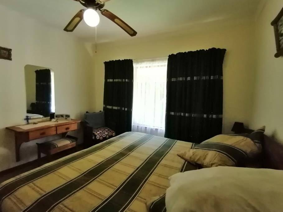 The lounge is large enough to comfortably host a lounge suite. From the lounge, you have access to a patio with a built-in braai. The kitchen is a comfortable size with ample built-in cupboards, a glass top hob, and an under-counter oven. From the kitchen you have access to an enclosed courtyard and the garage. From the dining room, you have access to another smaller patio. There are two bedrooms, two bathrooms and a study. All rooms are fitted with carpets and ceiling fans. The main bedroom is en-suite and a double bed can easily fit into each bedroom. The family bathroom has a shower, toilet, basin, and bathtub, while the en-suite bathroom has a toilet, shower, and basin and is adjacent to the walk-through dressing area.