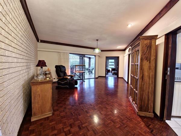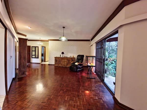 Beautiful home on the South Coast. A home where you will bask in South African nature and beauty. This home is located in a quiet neighbourhood and is located in a cosy cul-de-sac. This solidly built, gorgeous home with parquet flooring has great potential to brilliantly suit your tastes. A lovely home for a family, with a garden, a pool and breathtaking views. Each of the three large bedrooms has wooden floors and a view of the garden, the pool, and the patio. The large living and dining areas have access to the patio with expansive views, and swimming pool where there is much fun and socializing to be had.