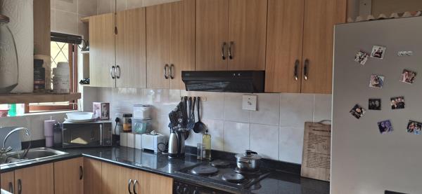 The open-plan lounge and dining area flows seamlessly into a well-appointed wood-panelled kitchen, complete with granite countertops. The main bedroom is generously sized and features ample built-in cupboards. A full bathroom is located adjacent to the main bedroom, along with a separate guest toilet. The second bedroom is also well-sized and includes plenty of cupboard space.