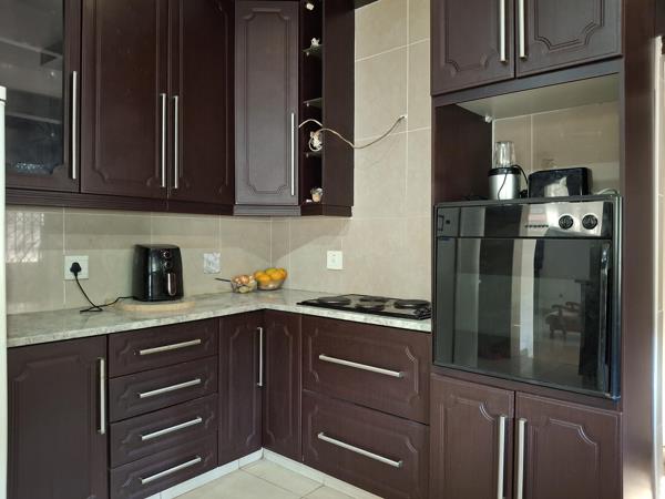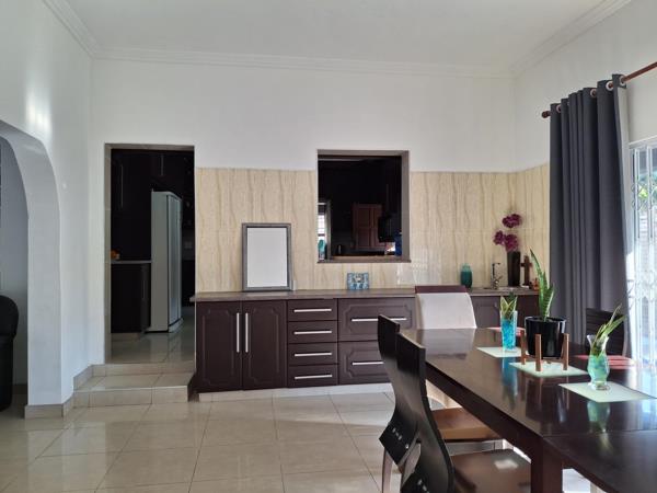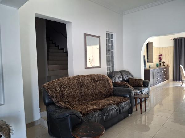 The main house fully furnished and has the following to offer. Down stairs has an open plan living and dining room with high ceilings. A beautiful newly installed kitchen has ample storage space and work top surfaces. The scullery and pantry is separate from the kitchen. The laundry is accessed from the outside of the house.