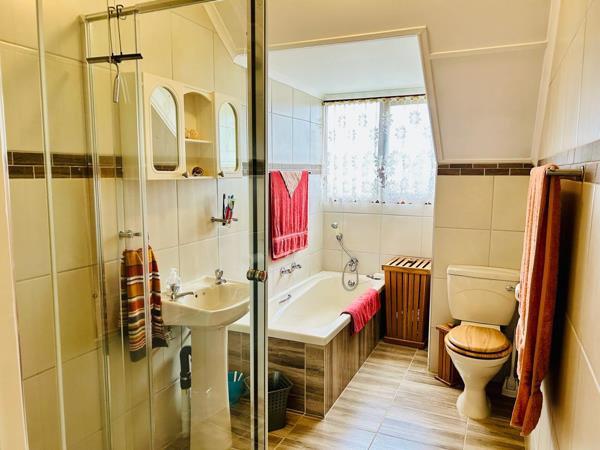Head upstairs to a private retreat. The large main bedroom is a highlight, boasting tiled floors, ample built-in cupboards, an air conditioner, and a ceiling fan. Enjoy distant sea views from your own private balcony on a clear day. The main ensuite is a full bathroom with a bath, shower, toilet, and basin, all fully tiled for a luxurious feel. The fourth bedroom, also upstairs, is versatile and currently used as a workroom. It features carpets, a ceiling fan, and built-in cupboards, and also provides access to a large attic for extra storage.
