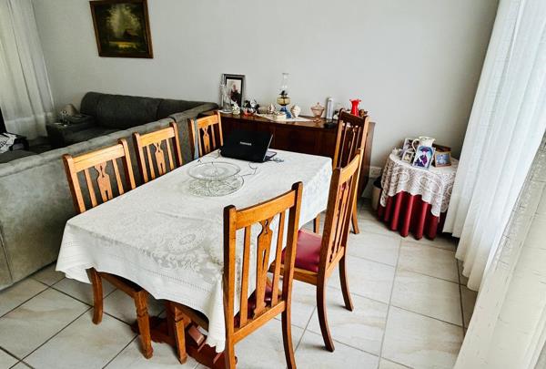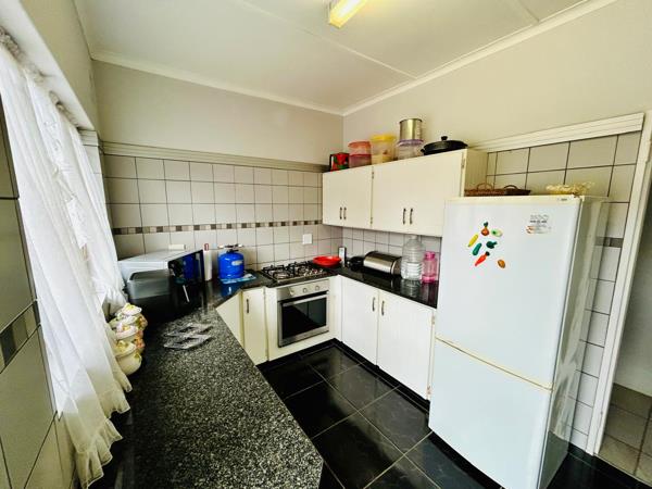 The main living area is an open-plan lounge and dining space with tiled floors, leading out to a covered patioideal for relaxing or a small braai. The kitchen is neat and functional, featuring granite tops, a gas hob, and an electric oven, with plenty of cupboards for storage.