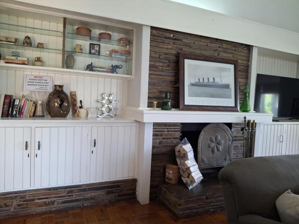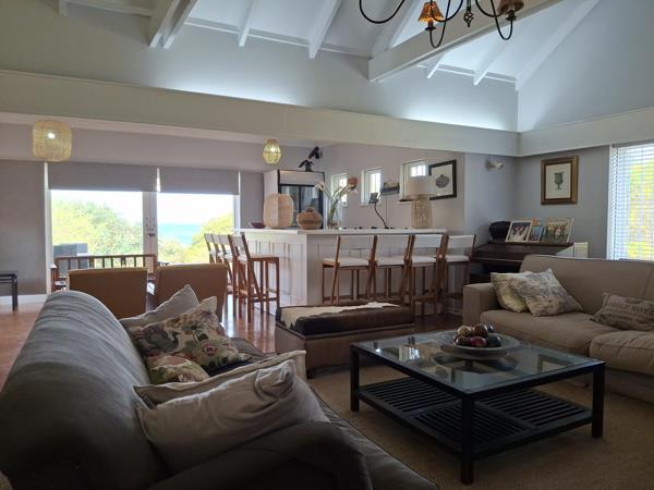 The large lounge, dining room and bar are open plan and lead through glass sliding doors onto the covered patio and braai area. Spectacular garden, swimming pool and ocean views can be enjoyed from these vantage points.