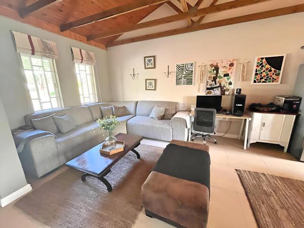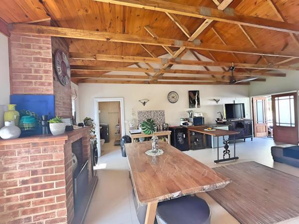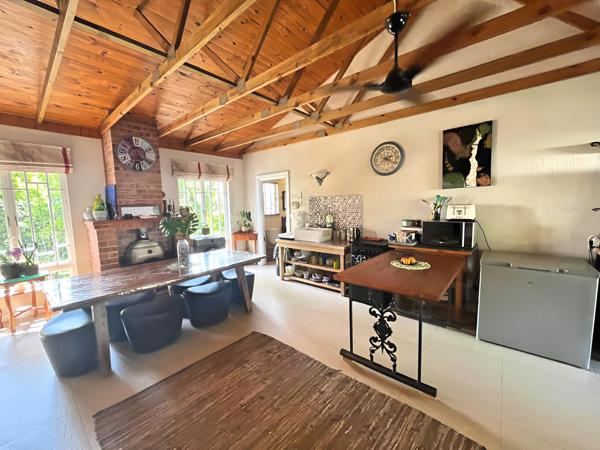 Inside, the main home features an open-plan lounge and dining area with exposed wooden beams that add warmth and character to the space. The modern kitchen is well-appointed with granite countertops, ample built-in cupboards, a gas hob, and an electric oven. Sliding doors open onto a covered entertainment patio overlooking a sparkling swimming poola perfect space for relaxed family living and weekend gatherings.