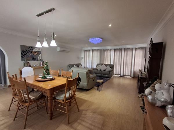 The home features a spacious open-plan dining and lounge area that seamlessly flows out to a patio overlooking the garden. There is also a sunroom with a lovely view of the garden.