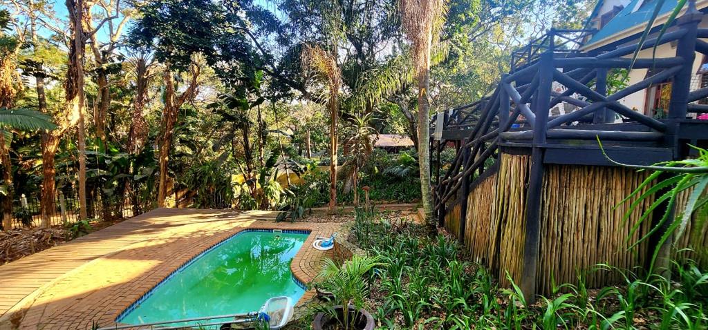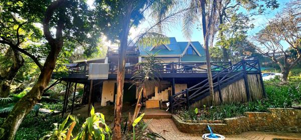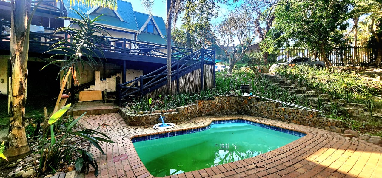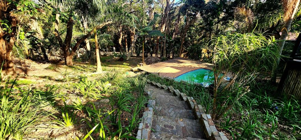 Situated in a lovely quiet area of Clansthal, surrounded by large trees, set on a large stand of 2,023m2 with plenty of space to be creative. This is an enchanting home, with high pitched roof, dormer windows, vaulted ceilings, Oregon pine flooring and doors and stained glass windows as accents, the ground floor has quarry tiles. Enter into the large open plan lounge, dining area with stacker doors opening to the covered patio and a lovely cottage style kitchen with wooden tops and a breakfast counter. On the ground level are 2 bedrooms with a full family bathroom. Up the attractive wooden stairway, to the mezzanine walkway (overlooking the lounge area) which leads to the 2 bedrooms and shower room, the one bedroom has a walk in closet and an ensuite toilet and basin, plus french doors opening to the upper deck/balcony, with nice views over the garden and pool. Under the home is a single garage and a one bedroom flat, perfect for earning extra income. The garden is sloped and has a wooden walkway leading to the pool area. There is a shadeport for 2 vehicles and plenty of extra parking space. This is a neat and exclusive property and well worth viewing for qualified buyers, please contact us ANYTIME to chat further!