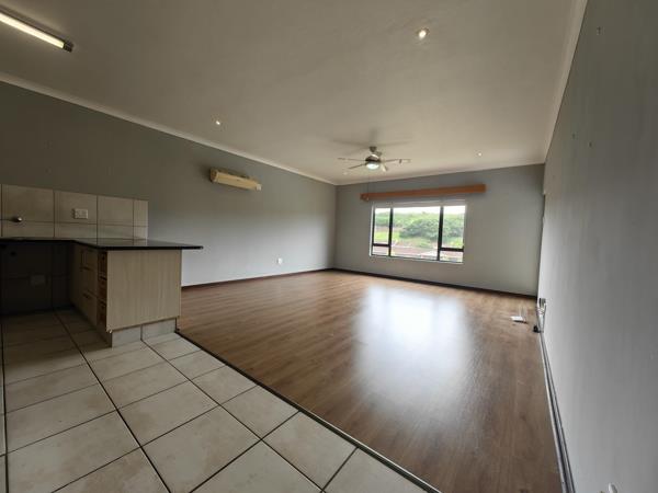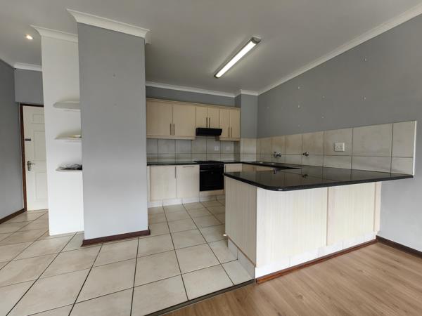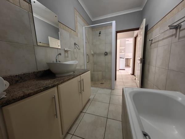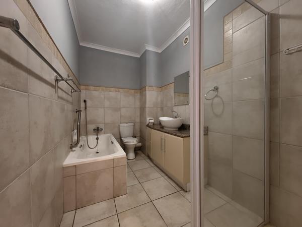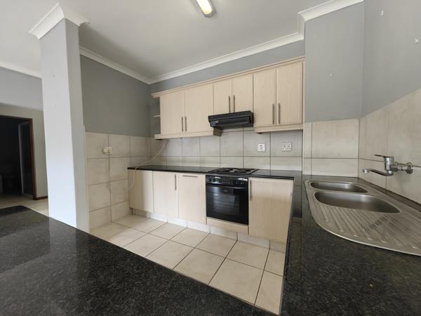 The well-sized kitchen is fitted with granite countertops, an electric oven and stovetop with extractor, and offers ample cupboard space for ease and practicality. A convenient linen cupboard is located in the passage.