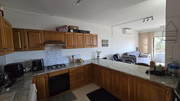 Step inside to an open-concept layout that seamlessly connects the kitchen, living, and dining areas. This spacious design is bathed in natural light, enhanced by large windows and a glass sliding door, and features air conditioning for year-round comfort. The functional kitchen is equipped with ample wooden cabinetry, granite-like countertops, a double sink, gas hob, electric oven, and dedicated dishwasher space, complemented by a convenient pantry and breakfast bar.