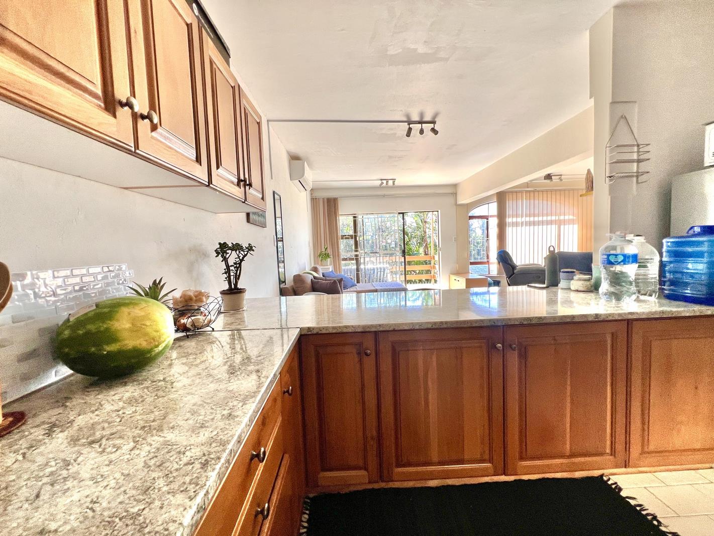 This unit has a secure entrance area and this bonus space is currently used for hobbies like woodwork. It has trellidors on the ground level and on the balcony doors, and an internal door leading into the apartment, from a spacious garage. A short set of stairs lead one up to a modern tiled and well lit-up lounge and dining area plus guest loo located on this level. The kitchen has been neatly renovated and includes a new gas stove as well as new attractive counter tops! The balcony that extends from the lounge is a wonderful refreshing feature for capturing the magic of the ocean whilst sipping on one''s morning coffee~a treat and privilege to be able to watch the whales and dolphin pods swim by.