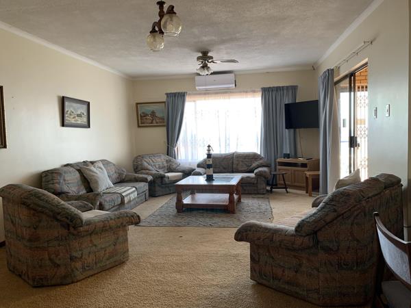 As you enter this home, you are greeted by a spacious entrance hall. The interior features mix of carpet in the lounge and bedrooms and tiles in the passage, kitchen and bathrooms. Each of the three well-appointed bedrooms is equipped with built-in wardrobes, ensuring ample storage space for all your belongings. The air conditioning and cooling fans create a refreshing atmosphere, perfect for those warm summer days.