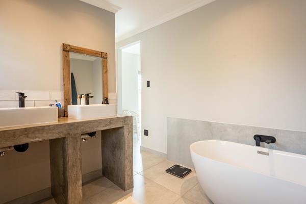 The designer kitchen is a standout, featuring Caesarstone countertops, low-hanging lamp shades for an ambient atmosphere, a free-standing gas stove, and a separate scullery and laundry. Accommodation includes three bedrooms and three bathrooms, all finished with elegance and style. Additional features include a tandem garage, a level garden, pre-cast walling, and top security with an electric fence and alarm system. This home effortlessly blends sophistication and functionality, offering charm, security, and a lifestyle ideal for families and entertainers alike.