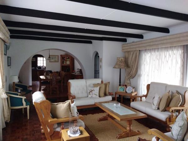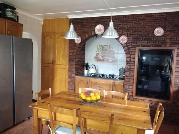 EXCLUSIVE MANDATE - The full package.....plus more. Immaculate home beautifully laid out with double garage and boma. Spacious, bright and airy. Very nice oak kitchen with laundry section. Kitchen flows into dining room which opens out onto a covered patio. Dining room also leads to living area and an entertainment room/tv lounge which opens out onto the undercover veranda and pool area. There are 3 very neat and spacious bedrooms with 2 bathrooms (main en-suite). Huge main bedroom also opens out onto the veranda overlooking the pool. The garden has special rock features and is beautifully landscaped. Property is a corner plot, very well maintained and secured with electric fencing plus boma and undercover braai. Property also includes an inverter and 6 solar panels plus a guest suite in the garden.