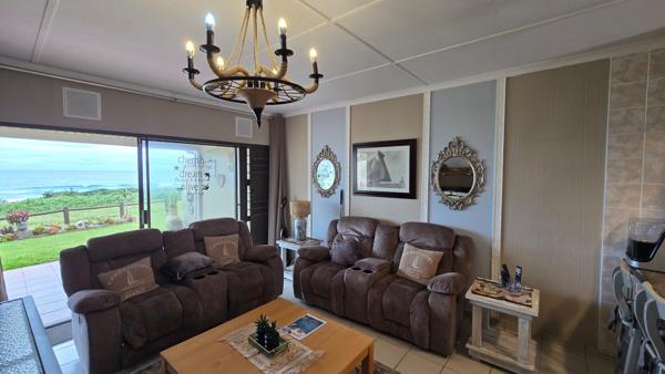 Step outside to embrace the idyllic outdoor living. A spacious, covered patio with large sliding glass doors provides abundant natural light and offers captivating direct ocean views, leading to a private, well-maintained garden and grassy yard. Enjoy leisurely days by the communal pool or host gatherings at the communal braai area. An outdoor shower is a thoughtful addition for post-beach rinse-offs. The property also includes a single garage and an additional parking bay, with paving for easy access.
