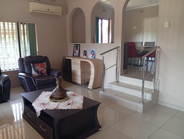 Step inside to an open-concept living space adorned with modern tiled flooring and neutral-toned walls, offering a versatile canvas for your personal style. The layout seamlessly connects the lounge and dining areas, featuring elegant architectural arches and a contemporary staircase with sleek metal railings. Air conditioning units are strategically placed for comfort throughout the home. The property boasts a dedicated dining room and a functional kitchen, visible through an archway, providing ample space for daily living and entertaining. A built-in storagebuffet unit adds practical elegance.