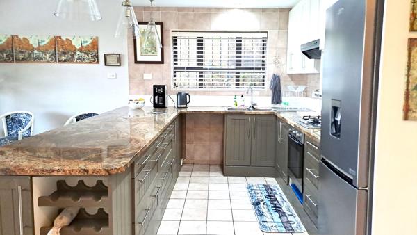 The kitchen is fitted with ample modern cupboards, a gas hob, undercounter oven, granite counter tops and has a walk-in pantry/broom cupboard.