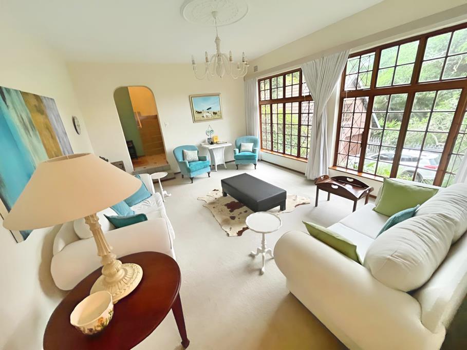 The entrance hall welcomes you into a warm and inviting downstairs living area that includes a spacious sunk in lounge, a dining room and a well-equipped kitchen with a separate scullery and pantry. The dining room opens out to a covered entertainment patio with a built-in braai, creating the perfect space for laid-back gatherings and outdoor dining.