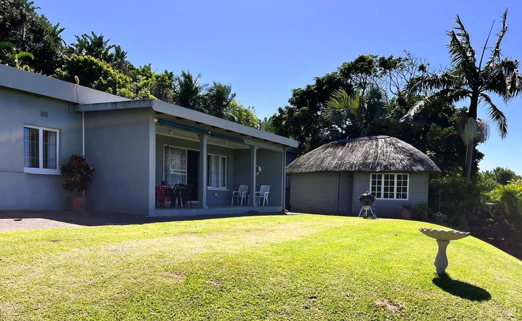 Double garages and a thatch cottage on either side of the 4 bedroom 2 bathroom house.