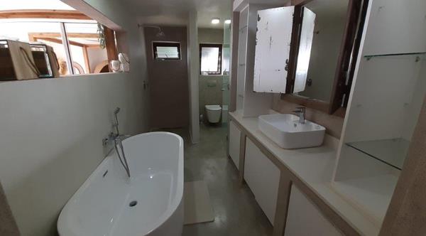 Upstairs at the back is a flat with 2 beds, 2 full bathrooms en-suite, light and sunny open plan lounge leading out onto a balcony with beautiful sea views, dining area with the kitchen at the back. Access can be completely separate from the house.
