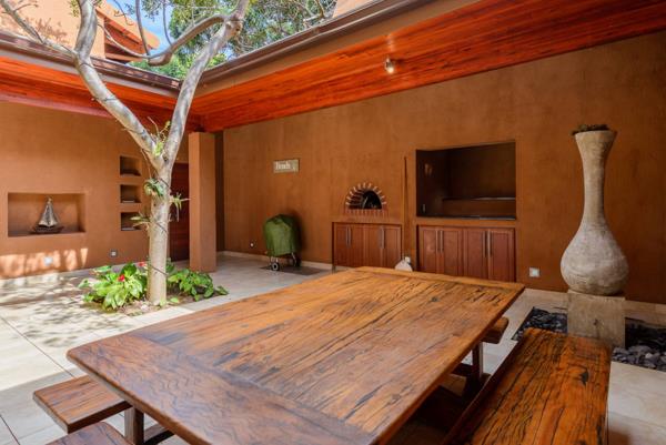 The gourmet kitchen complete with ocean views includes a gas stove, two electric ovens, a walk-in cold room, and all modern appliances. An indoor gas braai ensures braai-time never gets rained out.