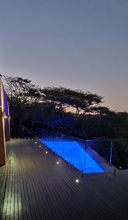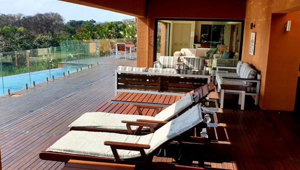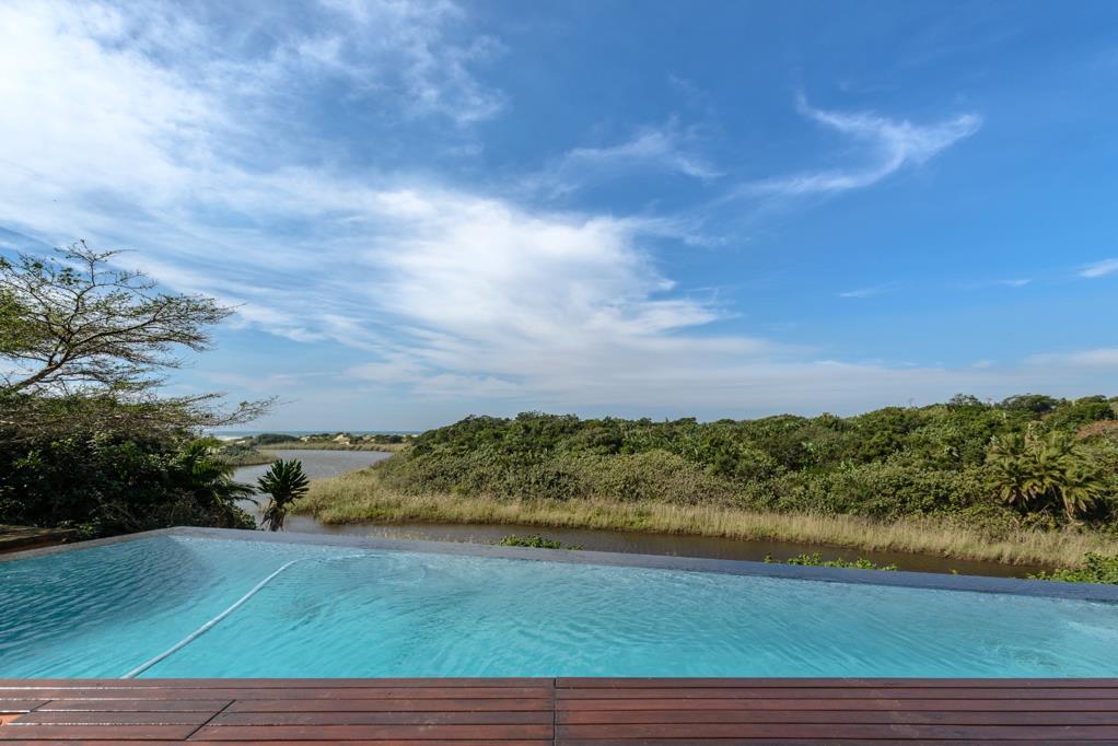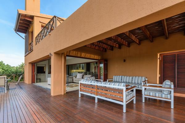 Sleeping accommodation downstairs comprises two spacious en-suite bedrooms with double volume ceilings and ample fitted cupboards. Both bedrooms open onto the sea facing wooden deck. The master suite and fourth en-suite bedroom is upstairs. Both bedrooms open onto a spacious, private patio with enclosed outside shower. The elevated views of the estuary, ocean and river are unbeatable! The master bedroom has a dressing room and luxurious bathroom with large shower and jacuzzi bath. This sensational villa is simply the best of the best that this world class golf estate offers.