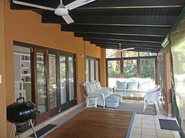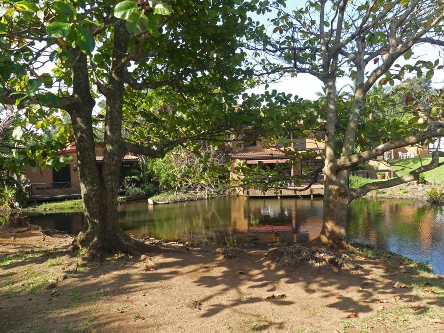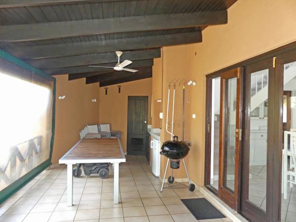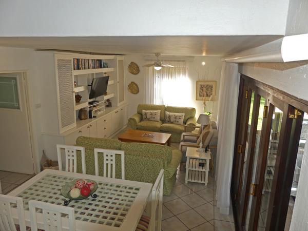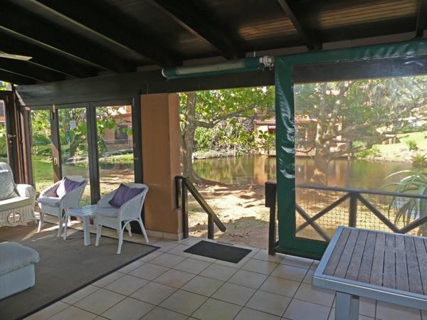 Located in a much sought after area in exclusive San Lameer Golf Estate, this tastefully refurbished villa has modern finishes throughout. The front entrance opens into an open plan living area comprising lounge and dining area. Stack doors open from the living room into a generous covered all weather patio with built in braai, which is absolutely perfect for entertaining or simply relaxing and enjoying the birdlife and tranquil natural environment. A few steps lead from the patio into the estate gardens and dam. The neat, fitted galley style kitchen has granite working surfaces, space for all major kitchen appliances and ample built in cupboards. A door leads from the kitchen to a large, enclosed area with cupboards, drying yard, and awesome open-air shower. There is also a spacious, air-conditioned, en- suite bedroom comprising toilet, basin and shower located on this level and opens into the outdoor shower area.