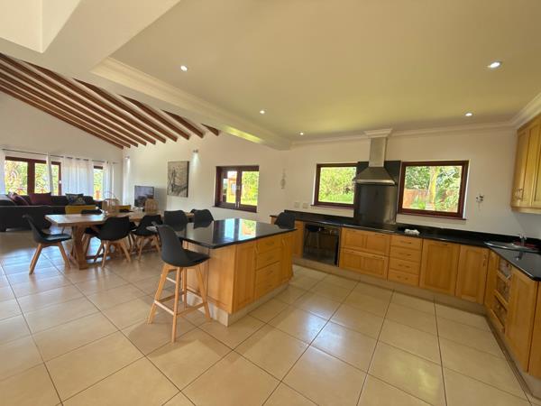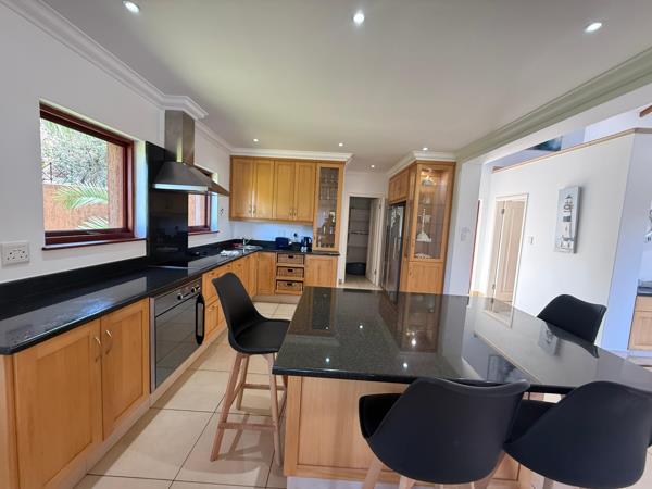 The kitchen is well-equipped with a stove, oven, microwave, fridge-freezer, dishwasher, washing machine, tumble dryer, tea- and coffee-making facilities, and cutlery and crockery. The dining area is furnished with a dining table suitable for 8 guests. The lounge area is furnished with comfortable couches, a coffee table, and a TV with DStv.