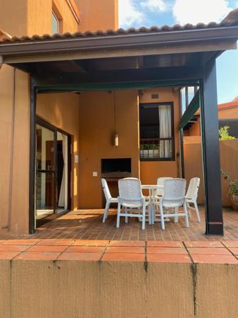 Spacious villa leading into estate gardens, with resident wildlife and overlooking a lovely dam. The villa is airconditioned and has a inverter in the event of power outages and a reserve water storage tank. Entrance leads into the reception rooms comprising open plan lounge leading through glass sliding doors onto a generous, partly covered patio with built in braai. A few stairs lead to the dining room and neat fitted kitchen wit granite working surfaces, ample fitted cupboards and a breakfast bar.