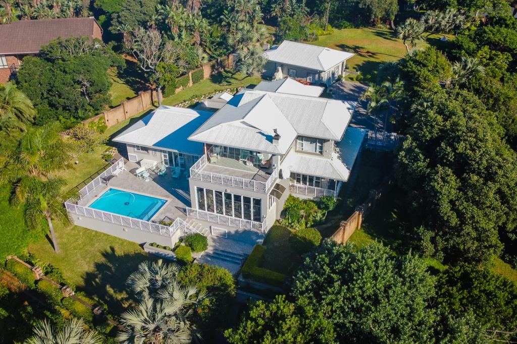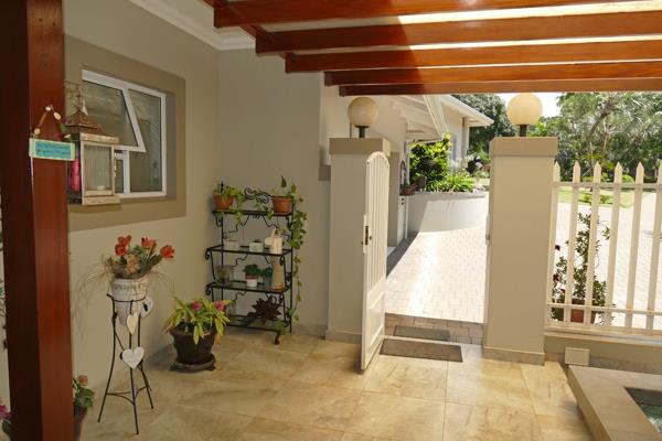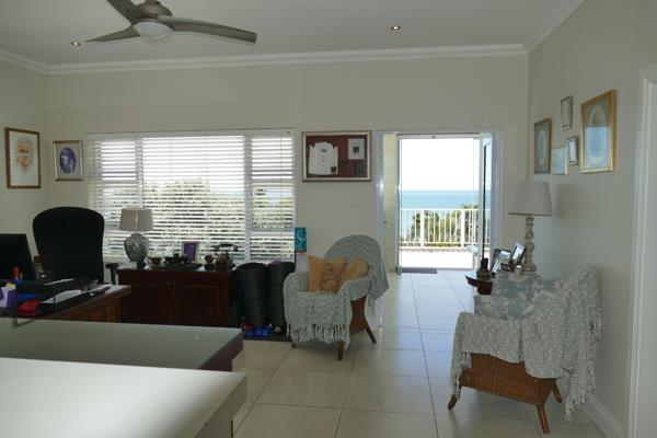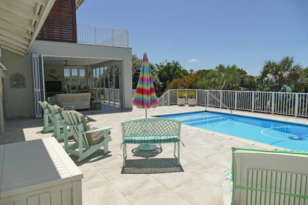 This meticulously maintained home is located at a prime address, walking distance to the golf course, beaches and village. An impressive driveway through the parklike garden leads to the entrance of this superb family home. A Double volume front door opens into the reception rooms comprising open plan lounge opening onto a generous glass enclosed patio leading out onto the pool area and front garden. A pedestrian gate from the front garden offers easy access to the golf course, beaches and coves. The dining room leads onto an open veranda and the well-designed kitchen with gas hob, electric oven, center island, granite working surfaces, ample parking space and separate scullery/ laundry opens into an enclosed courtyard. This courtyard leads to another courtyard containing a large gas cylinder cage to service the four gas geezers and gas hob. A 22 kva diesel generator with a 180 Litre fuel tank is used to back up the power supply to the home.