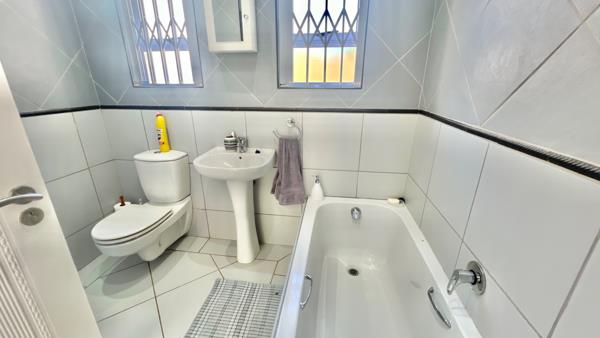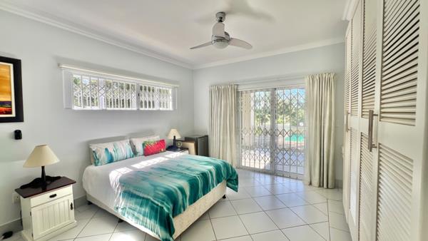 The ground floor also features a comfy bedroom with built-in cupboards, a ceiling fan and an en-suite bathroom with both a bath and direct access to the patio and pool area. Another bedroom on this level, also with built-in cupboards and a ceiling fan, has direct access to the patio and is serviced by a separate full bathroom.