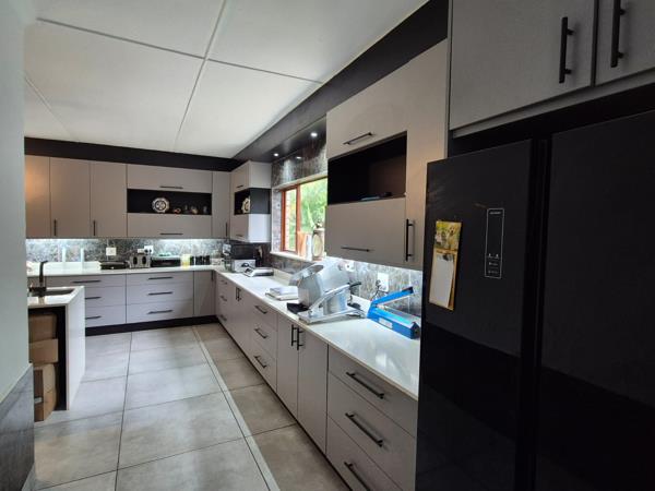 The sleek, contemporary kitchen is a chefs dream, featuring a central island, gas hob, eye-level oven, and ample cabinetry. A walk-in pantry and separate scullery/laundry add everyday convenience.