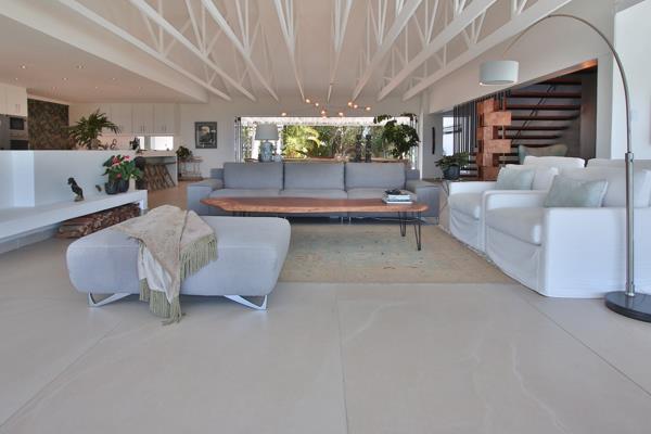 The reception areas are open plan and lead onto the entertainment areas, pool and gardens. The well-designed, fitted kitchen has ample Caesar stone working surfaces, gas hob and a generous breakfast bar. There is a separate scullery and spacious utility room laundry. Each bedroom and ensuite bathroom offers its own unique design detail. Four of the bedrooms have incredible sea views, while the fifth is located downstairs and is perfect as a guest-suite as it also has its own separate entrance and private garden. There is an exterior gym office and a spacious garage for three vehicles which provides direct access into the home. There is a borehole , reserve water storage tanks and an inverter with solar panels. This immaculate, modern home is also in move in condition and has been completely renovated with superior finishes throughout.